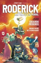 Roderick is a dedicated, young postman from the countryside making a delivery in Morhil, the biggest city on the entire continent. While his journey is initially exciting and the fantasy metro vibrant, the naïve Roderick is blind to Morhil's dark, sneaky underbelly. His precious cargo is stolen! And, what's more, he finds himself at the center of an even larger conspiracy surrounding the disappearance of a famous influencer! Will Roderick be able to prove himself as a postman by delivering the goods, or will this froggy bumpkin be crushed under the goings-on in the big city? Collecting issues #1-5 of Roderick and the City of Morhil, originally released by Comixology Originals and Stout Club, the creative powerhouse composed by comic creators Eduardo Medeiros, Mateus Santolouco, Rafael Albuquerque, and Rafael Scavone. Eduardo Medeiros' colorful, fantasy tale is the perfect pick for lovers of whimsy and the fantastical, filled with memorable characters and chock-full o' sight gags that allow the reader to linger on the page, looking for more. Presented in print for the first time by ABLAZE!