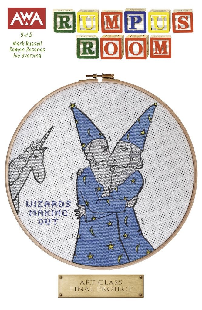 EISNER AND RINGO AWARD-WINNING WRITER MARK RUSSELL'S SATIRICAL THRILLER CONTINUES! Can Erica lead the captives out of the Rumpus Room and back to freedom? Find out in the latest chapter of Eisner and Ringo Award-winning writer Mark Russell's all-new satirical thriller! Erica concocts a plan to escape billionaire Bob Schrunk's nightmarish Rumpus Room…though it takes a lot of convincing to get the other prisoners to go along with it. Meanwhile, Schrunk takes his lawyer on a bizarre art shopping spree, all while dodging questions from the press concerning the strange rumors about his disappearing employees.