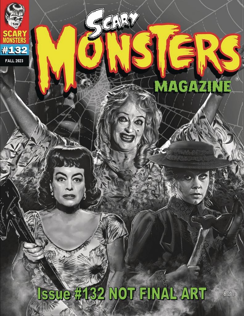 Our Scary Monsters Sinister Spinsters and Wicked Widows issue puts the scary spotlight on classic horror films starring famous actresses who played murderous human monsters, including Bette Davis, Joan Crawford, Shelley Winters, and others. Plus, memories of Halloween and fan favorite columns Kaiju Korner, Strange Days, Trilogy of Terror, and much more on square-bound retro pulp pages.