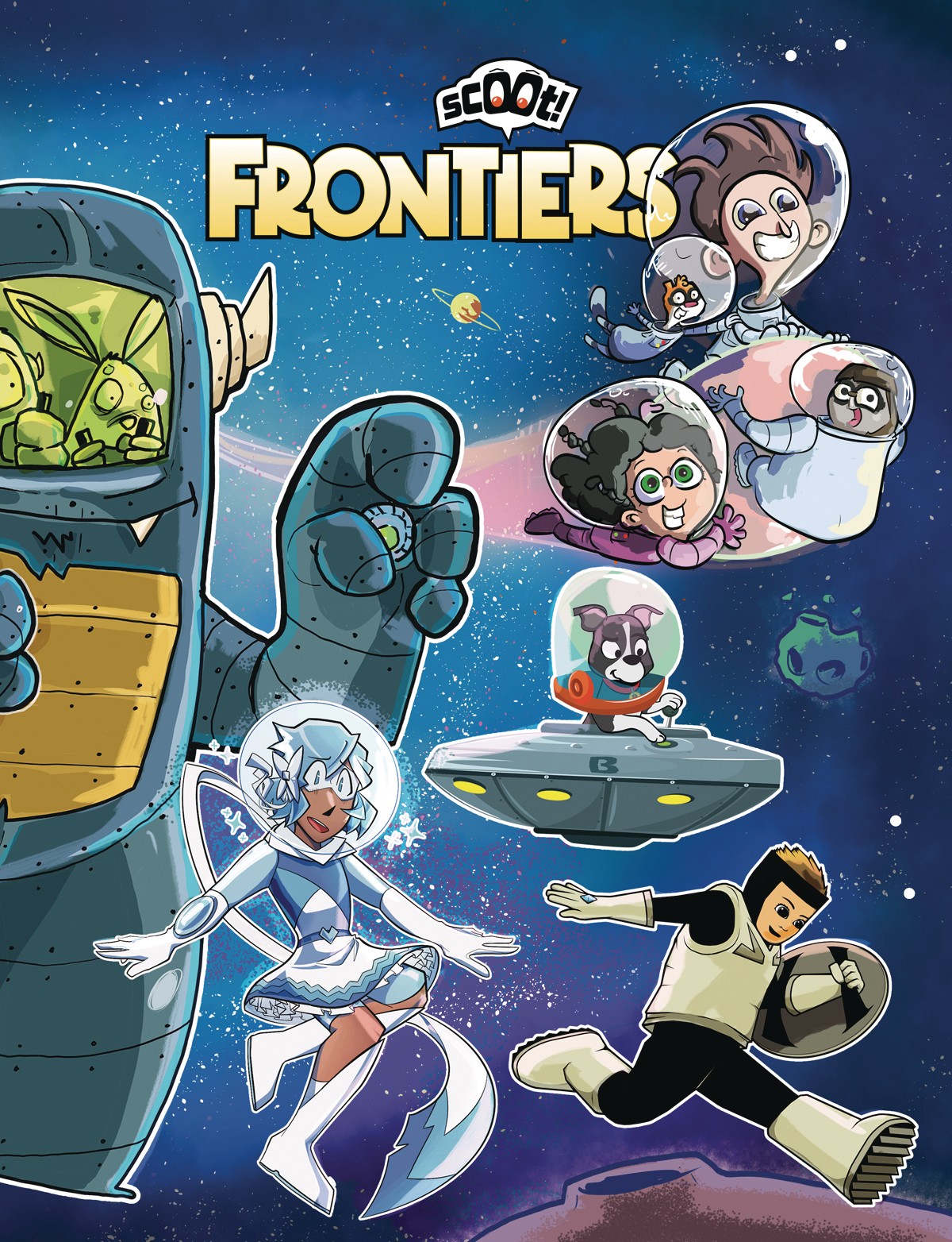 SCOOT IMPRINT: All-ages fun blasts off in Scoot Frontiers as we explore space with an intergalactic cast in all-new comic book adventures with puzzles, coloring pages, activities, short stories, poetry, and more! Featuring Misfitz Clubhouse, Wild Bull and Chipper, Byron, Bandit, Supercats, Soulstream, Little Guardians, The Ninja Scouts, Action Tank, Space Cadet, and the world premiere of Juniper! Scoot also invites young creators to participate with a chance that their work may be a part of future issues!