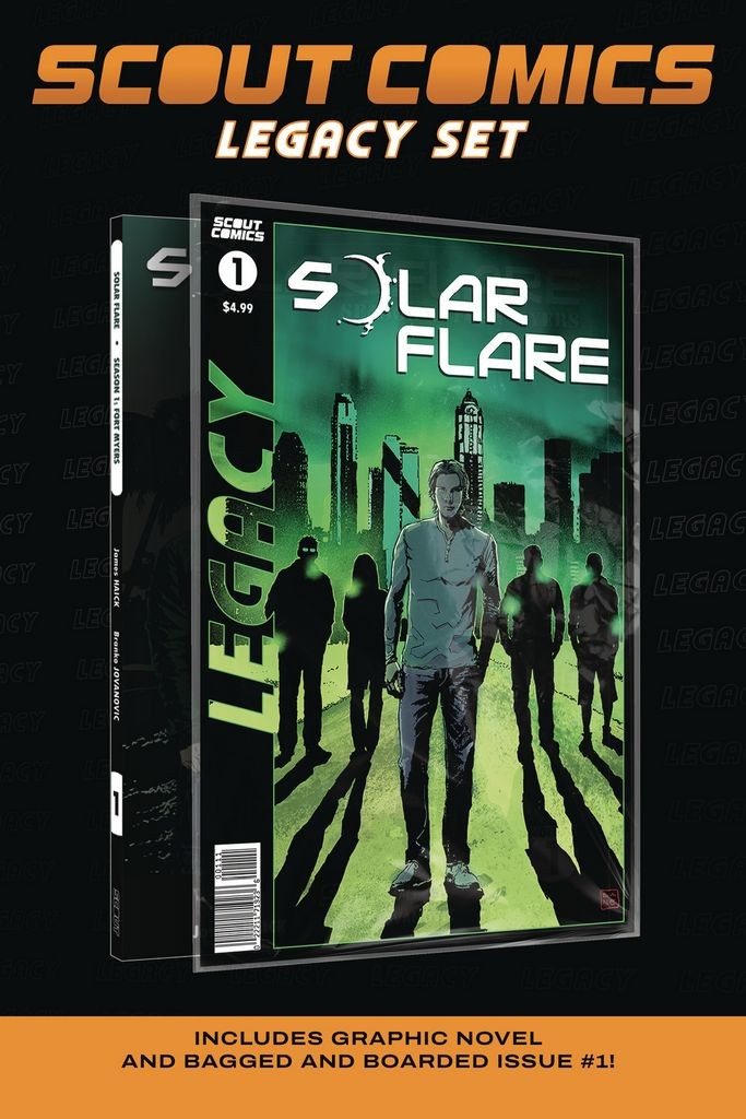 A Scout Legacy collector's pack! This beautifully designed hangable package (measures 8 1/2' x 12 3/4') includes a collectible first issue (bagged and boarded) and the complete trade paperback! Where were you when the world went dark? Solar Flare is the story of Jake Clifford and his friends traveling through a world where electronics no longer work after Earth is hit directly by a solar flare. Jake and his friends are trying to survive in this new post apocalyptic world while searching for his lost daughter. They find out almost immediately that they have a chance to help restart the world.