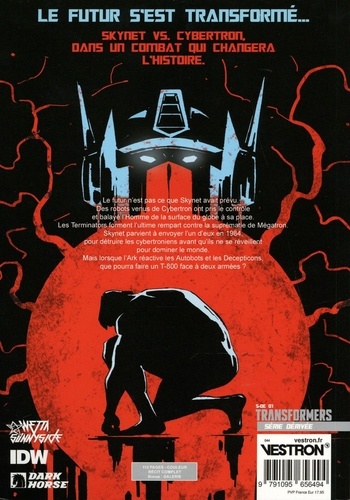"1984 : Lorsque des machines débarquent d'un autre temps, un gardien robotique saura-t-il se montrer capable de préserver le futur... ou faillira-t-il à sa mission d'empêcher les Decepticons de dominer le monde ? " Jouant des codes des deux célèbres franchises, cet album mixe leurs univers pour un récit inédit, fun et explosif : T-800 contre Cybertroniens, le crossover 'heavy metal' par excellence !
