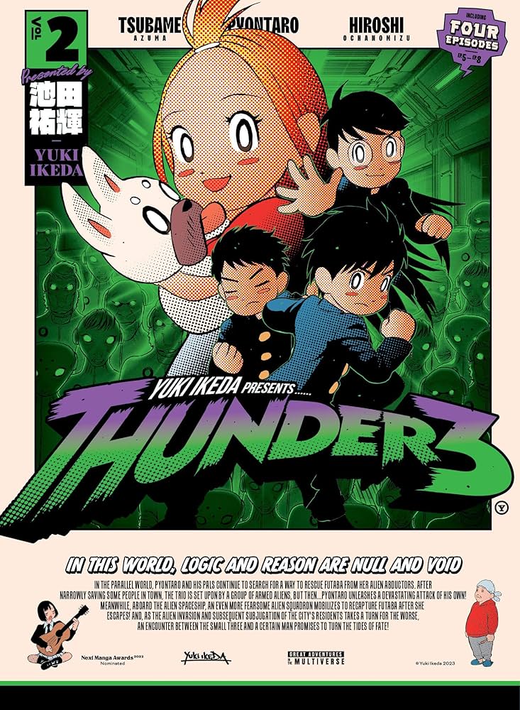 In the parallel world, Pyontaro and his pals continue to search for a way to rescue Futaba from her alien abductors. After narrowly saving some people in town, the trio is set upon by a group of armed aliens, but then Pyontaro unleashes a devastating attack of his own! Meanwhile, aboard the alien spaceship, an even more fearsome alien squadron mobilizes to recapture Futaba after she escapes! And, as the alien invasion and subsequent subjugation of the city's residents takes a turn for the worse, an encounter between the Small Three and a certain man promises to turn the tides of fate!