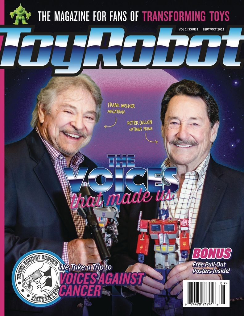 ToyRobot is written and created by Transformer collectors that have become authorities on the brand. For issue #9 the crew of TRM gets a rare chance to cover a brand new event! Voice Against Cancer is an all-star event where voice actors and celebrities team up to raise funds for this charitable cause. Our biggest interview to date includes Frank Welker and Peter Cullen! Bill, Erik, and Brian get a private in-person interview with these two legendary individuals. Wally Wingert talks to us about his involvement in the VAC and why it's such an important event. There is another possible world first as an unknown G1 Action Card resurfaces from an unlikely location!
