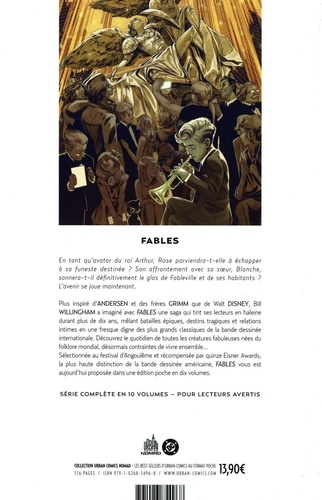 En tant qu'avatar du roi Arthur, Rose parviendra-t-elle à échapper à sa funeste destinée ? Son affrontement avec so soeur, Blanche, sonnera-t-il définitivement le glas de Fableville et de ses habitants ? L'avenir se joue maintenant. Plus inspiré d'ANDERSEN et des frères GRIMM que de Walt DISNEY, Bill WILLINGHAM a imaginé avec FABLES une saga qui tint ses lecteurs en haleine durant plus de dix ans, mêlant batailles épiques, destins tragiques et relations intimes en une fresque digne des plus grands classiques de la bande dessinée internationale. Découvrez le quotidien de toutes les créatures fabuleuses nées du folklore mondial, désormais contraintes de vivre ensemble... Sélectionnée au festival d'Angoulême et récompensée par quinze Eisner Awards, la plus haute distinction de la bande dessinée américaine, FABLES vous est aujourd'hui proposée dans une édition poche en dix volumes.