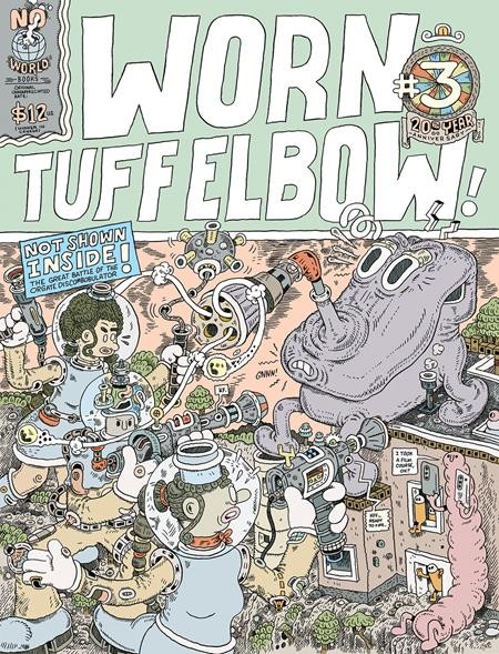 'Follow the journey of Slogan Schnauzer as he is set the task of locating the Orgate Discombobulator. Sidetracked by a group of “foodies” (that resemble cue balls on two legs) and a variety of other personalities, Slogan becomes confused and lost and eventually on a plane to Japan (and subsequently stripped of his current identity by the powers that be). Resembling a fever dream, this full colour comic strip is accompanied by lots of fake satirical ads and other odds and ends that will be sure to delight the reader including Bell’s foray back into satirical autobiographical comics. The exciting and dynamic third issue of Worn Tuff Elbow marks the 20th anniversary of this exciting series!'