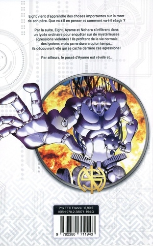 L'auteur de K en-Ichi, le disciple ulti me nous régale avec une comédie scolaire dynamique et renversante dans un lycée pour agents secrets. Eight vient d'apprendre des choses importantes sur la mort de son père. Que va-t-il en penser et comment va-t-il réagir ? Par la suite Eight, Ayame et Nohara s'infiltrent dans un lycée ordinaire pour enquêter sur de mystérieuses agressions violentes ! Ils profitent de la vie normale des lycéens, mais ça ne durera qu'un temps... Ils découvrent vite qui se cache derrière ces agressions ! Par ailleurs, le passé d'Ayame est révélé...