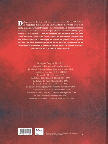 En treize batailles emblématiques, l'objectif de cet album est de raconter une histoire chronologique et militaire de la France, par 13 batailles victorieuses qui se sont déroulées sur le sol français, de Gergovie à la bataille de Montcornet. Chaque chapitre du livre sera évoqué sur 12 planches de récit BD, avec un personnage historique existant ou fictif comme point d'attention et construisant la narration. La sélection de ces batailles a été faite dans le respect d'une certaine répartition chronologique, géographique et thématique.