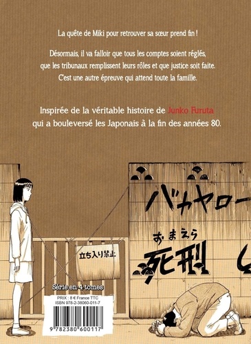 Sachiko n'a que 17 ans. Et c'est parce que de jeunes garçons veulent s'amuser qu'elle se retrouve séquestrée et va subir brimades, agressions et tortures des semaines durant. Personne ne veut la libérer car tous ont peur de faire face aux conséquences ! Personne ne semble se soucier de son sort, ni la police ni les parents. Seule sa soeur jumelle poursuit sans relâche les recherches car elle sait que sa soeur est en danger. Arrivera-t-elle à la retrouver avant que l'irréparable ne se produise ? Découvrez une histoire terrifiante, crue et révélatrice de la société japonaise, inspirée de la véritable histoire de Junko Furuta qui a bouleversé les Japonais à la fin des années quatre-vingts ! Manga en 4 tomes