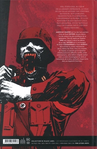 1936, Etats-Unis, au coeur de la grande dépression, la ville de Las Vegas entame une véritable mutation. Jeux d'argent, prostitution et corruption, y deviennent la norme, et à ces nouveaux maux s'ajoute celui, plus ancestral, d'une nouvelle race de vampire prête à entrer dans l'histoire... American Vampire est l'un des tout premiers titres de Scott Snyder, devenu depuis l'un des auteurs les plus prolifiques de sa génération. Très tôt repéré par Stephen King avec lequel il coécrit les débuts de sa saga, Snyder est ici accompagné de Rafael Albuquerque et Sean Murphy, deux artistes au renom international. De la création des Etats-Unis à la conquête de l'espace, en passant par la naissance d'Hollywood et les différents conflits armés contemporains, cette édition intégrale replace selon un ordre chronologique les récits et événements de la série, restituant chaque tome dans sa singularité historique.