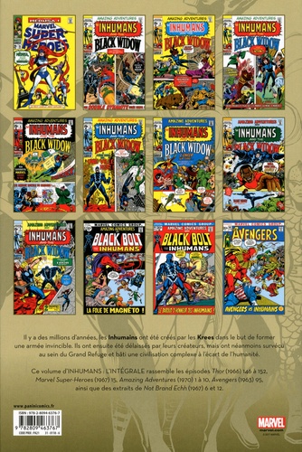 Il y a des millions d'années, les Inhumains ont été créés par les Krees dans le but de former une armée invincible. Ils ont ensuite été délaissés par leurs créateurs, mais ont néanmoins survécu au sein du Grand Refuge et bâti une civilisation complexe à l'écart de l'humanité. Ce volume d'Inhumans : l'intégrale rassemble les épisodes Thor (1966) 146 à 152, Marvel Super-Heroes (1967) 15, Amazing Adventures (1970) 1 à 10, Avengers (1963) 95, ainsi que des extraits de Not Brand Echh (1967) 6 et 12.