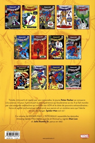 Timide, introverti et rejeté par ses camarades, le jeune Peter Parker se consacre à la science. Un jour, il prend part à une expérience qui bouleverse sa vie. Il se fait mordre par une araignée radioactive qui modifie son ADN et le dote de pouvoirs extraordinaires : force et agilité surhumaines, adhérence aux parois et un sixième sens qui l'alerte en cas de danger. Spider-Man est né ! Ce volume de SPIDER-MAN : L'INTEGRALE rassemble les épisodes Amazing Spider-Man (1963) 44 à 55 et l'Annual 4, signés Stan Lee et John Romita Sr, parus en 1967.