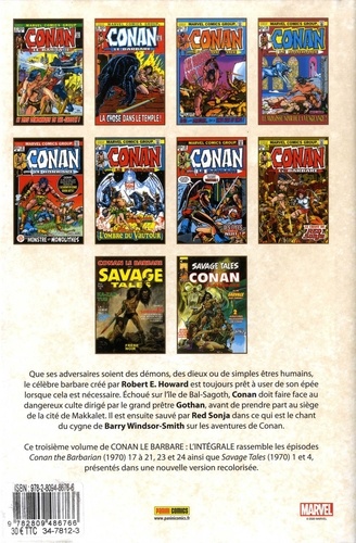 Que ses adversaires soient des démons, des dieux ou de simples êtres humains, le célèbre barbare créé par Robert E. Howard est toujours prêt à user de son épée lorsque cela est nécessaire. Echoué sur l'île de Bal-Sagoth, Conan doit faire face au dangereux culte dirigé par le grand prêtre Gothan, avant de prendre part au siège de la cité de Makkalet. Il est ensuite sauvé par Red Sonja dans ce qui est le chant du cygne de Barry Windsor-Smith sur les aventures de Conan. Ce troisième volume de CONAN LE BARBARE : L'INTEGRALE rassemble les épisodes Conan the Barbarian (1970) 17 à 21, 23 et 24 ainsi que Savage Tales (1970) 1 et 4, présentés dans une nouvelle version recolorisée.