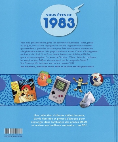 Vos Pogs, Totoches et cartes Crados s'échangeaient en douce à la récré ? Vos parents n'étaient pas fans de votre look lorsque vous sortiez en baggy, crop-top ou chaussures plateformes ? Les Froot Loops étaient vos céréales préférées, que vous accompagniez d'un verre de Sironimo ? Vous rêviez de combattre les vampires avec Buffy et de vous asseoir sur le canapé de Friends ? Vos Disney préférés étaient encore sur K7 VHS ? Pas de doute, vous êtes né en 1983 et ce livre est fait pour vous !