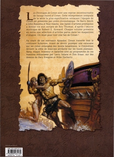 Les Chroniques de Conan sont une reprise incontournable de Savage Sword of Conan. Cette réimpression intégrale de la série la plus significative retraçant l'épopée de Conan est présentée par ordre chronologique. De Barry Smith à John Buscema et Neal Adams, une lignée d'artistes prestigieux a donné vie aux scripts de Roy Thomas, d'après l'oeuvre mythique de Robert E. Howard. Chaque volume présente en outre une sélection d'articles parus dans les magazines d'origine. Un must pour tout vrai fan de Conan ! Au cours de ces nouveaux épisodes, Conan traverse tout le continent hyborien. Avant de devoir protéger une caravane sur les cimes enneigées des monts kezankiens, le Cimmérien devient la cible de mauvais perdants sur les hauts plateaux. Sang, magie, honneur et batailles sont au programme de ces histoires scénarisées par Larry Yakata et Don Kraar, sur des dessins de Gary Kwapisz et Mike Docherty.