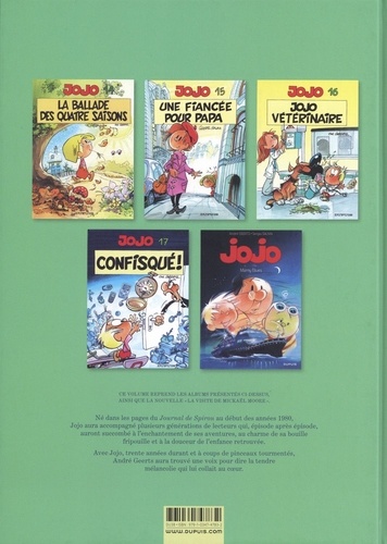 Ce dernier volume de la série rassemble les aventures de Jojo de 2004 à 2010 : "La Ballade des quatre saisons", "Une Fiancée pour papa", "Jojo vétérinaire", "Confisqué ! " et "Mamy Blues". Que de chemin parcouru pour André Geerts et Jojo, son alter ego imaginaire sorti tout droit de son enfance presque vingt-cinq ans plus tôt... Le trait rond des premiers albums a peu à peu cédé sous l'impulsion d'une plume virevoltante et désinvolte, mais toujours juste. Pourtant, Geerts nous plonge toujours avec autant de délicatesse dans les peines, les doutes et les questionnements de l'enfance, ravivant subtilement les nôtres. Chacune des aventures de Jojo est une révélation, émotionnelle bien sûr, tant l'auteur trouve le ton juste mais aussi le trait parfait pour souligner avec une infinie légèreté les contrastes de l'enfance. Alors qu'André Geerts a toujours cherché à restituer l'enfance dans sa vérité, sans en masquer les blessures et autres égratignures de l'âme, voilà que le destin s'en mêle et que la maladie de l'auteur vient interrompre définitivement le beau et long dialogue intime qu'il entretint avec Jojo pendant presque vingt-cinq ans. Sa disparition en 2010 entraîna de fait celle de son personnage, que cette réédition en intégrale permet de redécouvrir sous un jour nouveau, et sans doute encore plus fort.
