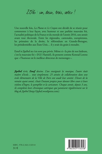 Une nouvelle fois, "La Plume" et "Le Crayon" ont décidé de se réunir pour commenter à leur façon, avec humour et une parfaite mauvaise foi, l'actualité politique de la France et du monde de l'année 2016, une année avant tout électorale. Entre les régionales, cantonales, européennes, les primaires de la droite, le référendum en Grande-Bretagne, les présidentielles aux Etats-Unis... il y avait du grain à moudre (multiples illustrations en couleur).