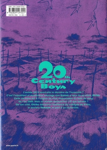 Ami a été assassiné ! Si la mort du dirigeant plonge le monde dans l'affliction, elle est au contraire une délivrance pour les anciens compagnons de Kenji, puisqu'elle signifie la fin de leur combat. Mais la crise mondiale est-elle bel et bien terminée ? Rien n'est certain. En tant qu'héritière de la volonté de Kenji, Kanna a une nouvelle mission. Une série qui n'est plus à présenter ! Ce thriller passionnant s'est vu décerner le prix des éditions Kodansha, fait rarissime puisqu'il était publié par un autre éditeur. En France, le manga de Naoki Urasawa a reçu le prix du meilleur scénario Angoulême 2004 et a été couronné d'un Japan Expo Awards en 2008. Cette nouvelle édition bénéficie de pages couleur, d'une traduction revue, d'une fin inédite qui reprend la conclusion de l'adaptation en film de 20th Century Boys et d'un marque-page offert avec chaque tome.