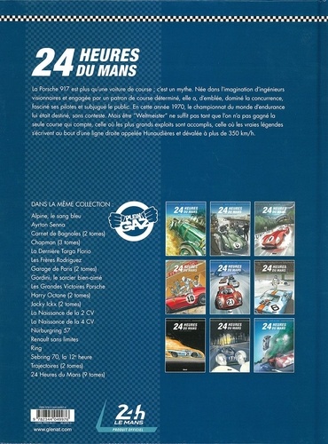 Porsche : la naissance du mythe. Immortalisée par Steve McQueen dans son film Le Mans, la Porsche 917 est devenue une des plus grandes icônes de la course automobile. Mais avant cela, la 917 est l'aboutissement du travail de Porsche au plus haut niveau de la compétition. Grace à ce prototype, mis au point avec l'aide des plus grands pilotes de l'époque (Rodriguez, Siffert, Redman, Piper, etc.), Porsche peut enfin viser la victoire au classement général des 24 Heures du Mans 1970, voire remporter le championnat d'endurance. Les Ford GT40, après 4 ans de domination, sont vieillissantes, les Matra, elles, sont encore trop jeunes. En revanche, Ferrari, avec ses nouvelles 512 S et ses pilotes de talent, font figure d'épouvantail et vont rendre la tâche difficile à Porsche. Mais rien n'arrête une légende qui s'écrit, surtout à cette vitesse ! Ce nouvel album de la collection "Plein Gaz" consacré à la célèbre course mancelle revient sur une période mythique, certainement la plus attendue par les fans !