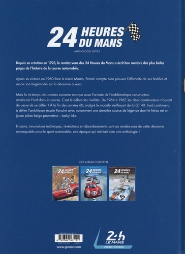 Revivez en BD les grands moments de la plus célèbre des courses d'endurance ! Depuis sa création en 1923, le rendez-vous des 24 Heures du Mans a connu des moments d'anthologie. Après sa victoire en 1960 face à Aston Martin, Ferrari compte bien prouver l'efficacité de ses TR61 et 250GT. En 1961, la marque italienne au cheval cabré s'apprête à devenir hégémonique. Mais le mitan des années 60 marque aussi l'arrivée de l'emblématique constructeur américain Ford dans la course. C'est le début des rivalités. De 1964 à 1967, les deux constructeurs n'auront de cesse de se défier ! A la fin des années 60, malgré le modèle vieillissant de la GT 40, Ford continuera à défier l'ambitieuse écurie Porsche avec notamment une dernière course de légende dont le héros est un jeune pilote belge prometteur : Jacky Ickx.