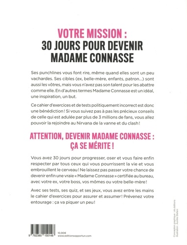 Ses punchlines vous font rire, même quand elles sont un peu vachardes. Ses cibles (ex, belle-mère, enfants, patron...) sont aussi les vôtres, mais vous n'avez pas son talent pour les abattre comme elle. En d'autres termes Madame Connasse est un idéal, une inspiration, un but. Ce cahier d'exercices et de tests politiquement incorrect est donc une bénédiction ! Si vous suivez pas à pas les précieux conseils de celle qui est adulée par plus de 3 millions de fans, vous allez pouvoir la rejoindre au Nirvana de la vanne et du clash ! Attention, devenir Madame Connasse : ça se mérite ! Vous avez 30 jours pour progresser, oser et vous faire enfin respecter par tous ceux qui vous pourrissent la vie et vous embrouillent le cerveau ! Ne laissez pas passer votre chance de devenir enfin une vraie " Madame Connasse "certifiée au bureau, avec votre ex, votre boss, vos mômes ou votre belle-mère ! Avec ses tests, ses quiz, et ses jeux, vous avez entre les mains le cahier d'exercices pour assurer et assumer ! Prévenez votre entourage : ça va piquer un peu !