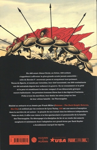 En 480 avant Jésus-Christ, en Grèce, 300 soldats s'apprêtent à affronter la plus grande armée jamais assemblée : celle de Xerxès Ier, souverain perse et conquérant tout-puissant. Venus de Sparte, et menés par Léonidas, leur chef incontesté, ces 300 combattants ont été entraînés depuis leur enfance à la guerre. Ils ne connaissent ni la pitié ni la peur et constituent le dernier rempart d'une démocratie grecque encore balbutiante : les premiers hommes libres face à des légions d'esclaves. Prêts à tous les sacrifices, leur destin les mène jusqu'au lieu de leur ultime bataille : les Thermopyles. Réalisé au scénario et au dessin par Frank Miller (Batman ? The Dark Knight Returns, Sin City) et sublimé par les couleurs de Lynn Varley, 300 est une oeuvre d'exception dans la carrière de cet auteur : le pinacle de son travail chez les éditeurs indépendants. Dans ce récit, il offre une vision à la fois spectaculaire et personnelle de la bataille des Thermopyles. Un découpage à la discipline de fer et un rendu des assauts sanglants et saisissants dont l'adaptation sur grand écran par Zack Snyder a durablement marqué les esprits.