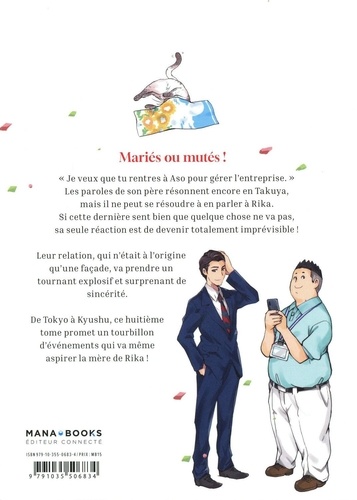 Mariés ou mutés ! "Je veux que tu rentres à Aso pour gérer l'entreprise. " Les paroles de son père résonnent encore en Takuya, mais il ne peut se résoudre à en parler à Rika. Si cette dernière sent bien que quelque chose ne va pas, sa seule réaction est de devenir totalement imprévisible ! Leur relation, qui n'était à l'origine qu'une façade, va prendre un tournant explosif et surprenant de sincérité. De Tokyo à Kyushu, ce huitième tome promet un tourbillon d'événements qui va même aspirer la mère de Rika !