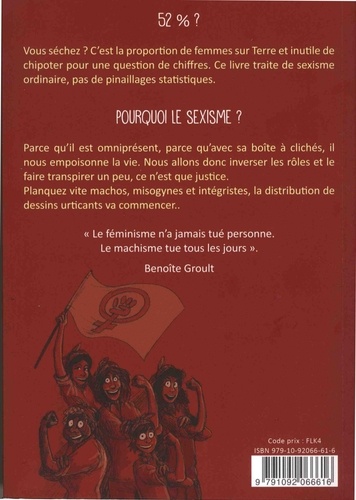 52%? Vous séchez ? C'est la proportion de femmes sur Terre et inutile de chipoter pour une question de chiffres. Ce livre traite de sexisme ordinaire, pas de pinaillages statistiques. Pourquoi le sexisme ? Parce qu'il est omniprésent, parce qu'avec sa boîte à clichés, il nous empoisonne la vie. Nous allons donc inverser les rôles et le faire transpirer un peu, ce n'est que justice. Planquez vite machos, misogynes et intégristes, la distribution de dessins urticants va commencer...