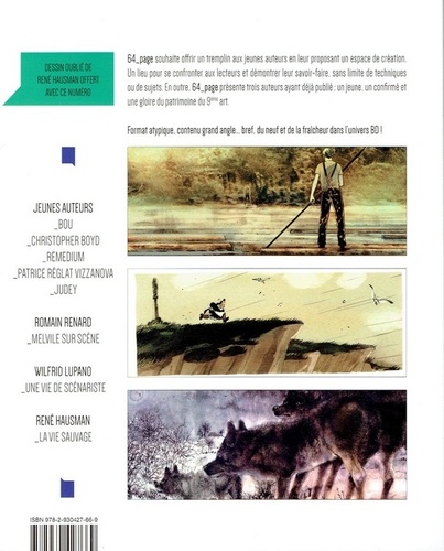 64_Page souhaite offrir un tremplin aux jeunes auteurs acteurs en leur proposant un espace de création. Un lieu pour se confronter aux lecteurs et démontrer leur savoir-faire, sans limites de techniques ou de sujet. En outre, 64_page présente trois auteurs ayant déjà publié : jeune, un confirmé et une gloire du patrimoine du 9ème art.