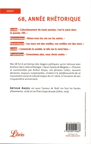 Cordial"L'aboutissement de toute pensée, c'est le pavé dans ta gueule, CRS". Ergonomique"Aimez-vous les uns sur les autres". Paranoïaque"Les murs ont des oreilles, vos oreilles ont des murs". Lucide"J'emmerde la société, et elle me le rend bien". Prophétique"Consommez plus, vous vivrez moins". Mai 68 fut le printemps des slogans politiques, qu'on retrouve avec bonheur dans cette anthologie "facon Cyrano de Bergerac". Choisies et commentées par Arthur Anjou, ces phrases cultes, souvent abrasives, toujours surprenantes, invitent à la (re)découverte de ce mouvement social et culturel majeur du XXe siècle, à l'occasion de son cinquantième anniversaire.