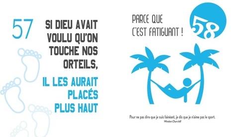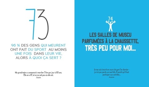Le cadeau idéal pour ôter toute culpabilité à ceux qui ne sont pas des accros du jogging. Un recueil à petit prix, drôle, pétillant et intéressant : faits incroyables, infos scientifiques, citations, dictons... Pourquoi ne pas faire de sport ? Parce que c'est fatiguant ! Les salles de muscu parfumées à la chaussette, très peu pour moi...