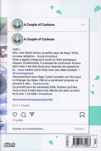 Hello ! Moi, c'est Sachi Umino, la petite soeur de Nagi ! Enfin, sa soeur adoptive... #cestcompliqué Erika a appris à Nagi qu'il aurait un frère biologique disparu. Evidemment, il a essayé de confronter Amano père mais il est très doué pour esquiver les questions et... nous mettre mal à l'aise avec ses idées tordues ! #momentgênant Heureusement pour Nagi, il peut compter sur Hiro pour lui changer les idées. Elle lui a carrément proposé un rencard à vélo... #çaroucoule Ca promet pour les vacances d'été. Surtout qu'Erika nous a tous invités dans une villa de son père au bord de la mer ! J'ai hâte ! #viedeluxe