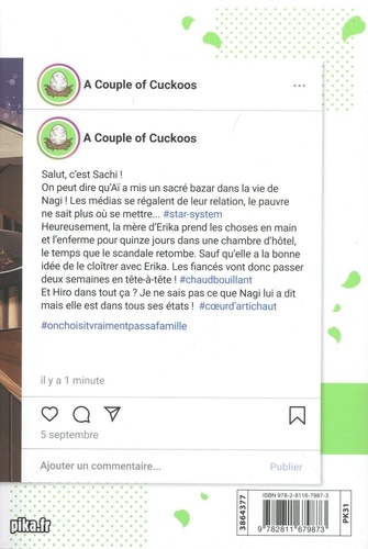 Salut, c'est Sachi ! On peut dire qu'Aï a mis un sacré bazar dans la vie de Nagi ! Les médias se régalent de leur relation, le pauvre ne sait plus où se mettre... #star-system Heureusement, la mère d'Erika prend les choses en main et l'enferme pour quinze jours dans une chambre d'hôtel, le temps que le scandale retombe. Sauf qu'elle a la bonne idée de le cloîtrer avec Erika. Les fiancés vont donc passer deux semaines en tête-à-tête ! #chaudbouillant Et Hiro dans tout ça ? Je ne sais pas ce que Nagi lui a dit mais elle est dans tous ses états ! #coeurd'artichaut