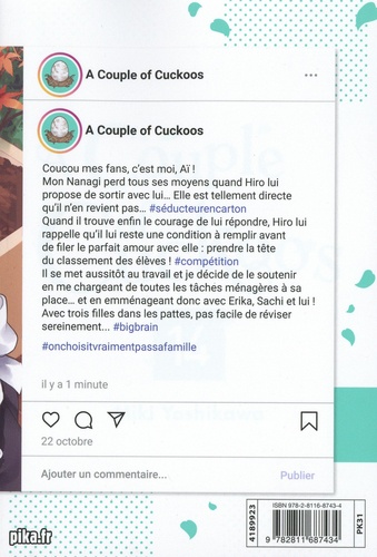 Coucou mes fans, c'est moi, Aï ! Mon Nanagi perd tous ses moyens quand Hiro lui propose de sortir avec lui... Elle est tellement directe qu'il n'en revient pas... #séducteurencarton Quand il trouve enfin le courage de lui répondre, Hiro lui rappelle qu'il lui reste une condition à remplir avant de filer le parfait amour avec elle : prendre la tête du classement des élèves ! #compétition Il se met aussitôt au travail et je décide de le soutenir en me chargeant de toutes les tâches ménagères à sa place... et en emménageant donc avec Erika, Sachi et lui ! Avec trois filles dans les pattes, pas facile de réviser sereinement... #bigbrain