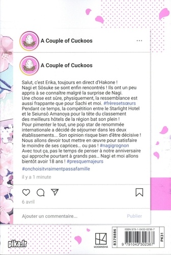 Salut, c'est Erika, toujours en direct d'Hakone ! Nagi et Sôsuke se sont enfin rencontrés ! Ils ont un peu appris à se connaître malgré la surprise de Nagi. Une chose est sûre, physiquement, la ressemblance est aussi frappante que pour Sachi et moi. #frèresetsoeurs Pendant ce temps, la compétition entre le Starlight Hotel et le Seiunsô Amanoya pour la tête du classement des meilleurs hôtels de la région bat son plein ! Pour pimenter le tout, une pop star de renommée internationale a décidé de séjourner dans les deux établissements... Son opinion risque bien d'être décisive ! Nous allons devoir tout mettre en oeuvre pour satisfaire le moindre de ses caprices... ou pas ! #nagigrognon Avec tout ça, pas le temps de penser à notre anniversaire qui approche pourtant à grands pas... Nagi et moi allons bientôt avoir 18 ans ! #presquemajeurs #onchoisitvraimentpassafamille