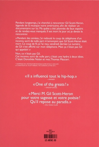 Pendant longtemps, j'ai cherché à rencontrer Gil Scott-Heron, légende de la musique noire américaine, afin de réaliser un documentaire sur lui. Ma quête a été jalonnée de faux espoirs et de rendez-vous manqués. Il est mort le jour où je devais le rencontrer. "Pendant des années, j'ai redouté le coup de téléphone d'un inconnu sorti de nulle part m'annonçant que Gil Scott-Heron était mort. Ce coup de fil, je l'ai reçu vendredi dernier. Le numéro de Gil s'est affiché sur mon téléphone. Mais ça n'était pas Gil qui appelait." Non, ce n'était pas Gil. Cet inconnu sorti de nulle part, c'était une hydre à deux têtes. C'était Dorothée Nolan et moi,Thomas Mauceri.