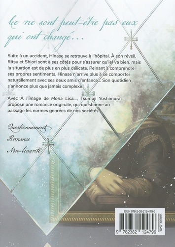 Avec à l'image de Mona Lisa... , Tsumuji Yoshimura propose une romance originale, qui questionne au passage les normes genrées de nos sociétés. Suite à un accident, Hinase se retrouve à l'hôpital. à son réveil, Ritsu et Shiori sont à ses côtés pour s'assurer qu'iel va bien, mais la situation est de plus en plus délicate. Peinant à comprendre ses propres sentiments, Hinase n'arrive plus à se comporter naturellement avec ses deux amis d'enfance... Son quotidien s'annonce plus que jamais complexe !