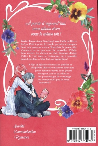 A Sign of Affection décrit avec pudeur et simplicité l'histoire d'amour entre une jeune femme sourde et un grand voyageur. A n'en pas douter, les personnages de ce manga ne manqueront pas de vous émouvoir ! Yuki et Itsuomi ont déménagé avec l'aide de Rin et Kyôya. Petit à petit, le couple prend ses marques dans son nouveau cocon. Toutefois, la jeune fille s'inquiète de ne pas avoir de nouvelles d'Ôshi. Pour mettre les choses au clair, Itsuomi décide d'aller le voir dans le restaurant où il travaille quand soudain... Shin fait son apparition !