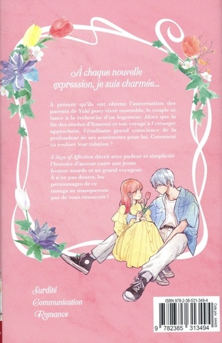 A Sign of Affection décrit avec pudeur et simplicité l'histoire d'amour entre une jeune femme sourde et un grand voyageur. A n'en pas douter, les personnages de ce manga ne manqueront pas de vous émouvoir ! A présent qu'ils ont obtenu l'autorisation des parents de Yuki pour vivre ensemble, le couple se lance à la recherche d'un logement. Alors que la fin des études d'Istuomi et son voyage à l'étranger approchent, l'étudiante prend conscience de la profondeur de ses sentiments pour lui. Comment va évoluer leur relation ?