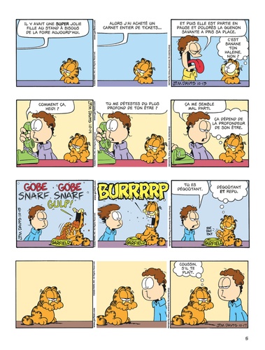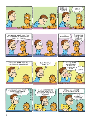 Chaque repas est une fête pour Garfield ! Et un cauchemar pour Jon, son soi-disant "maître" ... Garfield est aussi un danger pour tous les livreurs de pizzas de la Terre, tous les réveille-matin du monde, toutes les araignées de la Création, et tous les chiens de garde du quartier ! Attention, rien n'arrête un chat glouton sur le chemin de sa gamelle...