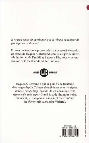 Je ne crois pas avoir appris quoi que ce soit qui ne comportât pas la promesse du sourire. En vous invitant à une promenade dans ce recueil d'extraits de textes de Jacques A. Bertrand, choisis au gré de notre admiration et de l'amitié qui nous a liés, nous espérons vous offrir le meilleur de cet écrivain rare.