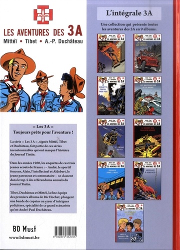 Toujours prêts pour l'aventure ! La série "Les 3A", signée Mittel, Tibet et Duchéteau, fait partie de ces séries incontournables qui ont marqué l'histoire du Journal Tintin. bans les années 1960, les enquêtes de ces trois jeunes scouts de France : - André, le sportif fonceur, Alain, l'intellectuel et Aldebert, le jeune paresseux et contestataire - se classent dans le top-5 des référendums annuels du Journal Tintin. Tibet, Duchâteau et Mittéï, la fine équipe des premiers albums de Ric Hochet, plongent une bande de copains au coeur d'intrigues policières, spécialité de ce grand scénariste qu'est André-Paul Duchâteau.