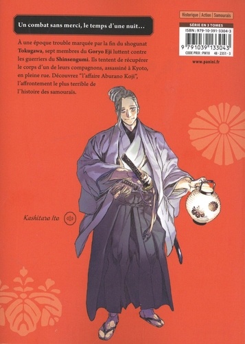 L'incident d'Aburanokoji. Ce fut la dernière lutte interne au sein du Shinsengumi et l'une de ses plus sanglantes. Dans les derniers jours mouvementés du shogunat Tokugawa, sept combattants durent affronter le Shinsengumi à Kyoto afin de récupérer les corps de leurs hommes assassinés, et c'est là, lors de cette nuit horrible et sanglante, que le fer des épéistes se croisent... Abura est la première oeuvre de Kuchizuku Bakukyuuzou, un jeune artiste qui avait déjà travaillé sur une anthologie dédiée à Touken Ranbu. Number 8 est un scénariste qui a notamment participé à la saga Blue Giant. Nous plongeant dans un récit historique haletant, le duo nous offre une fresque guerrière qui nous emmène dans l'une des périodes les plus chaotiques du Japon. Un manga où se mêlent drames, combats spectaculaires et guerriers prêts à donner leur vie pour atteindre leur but.