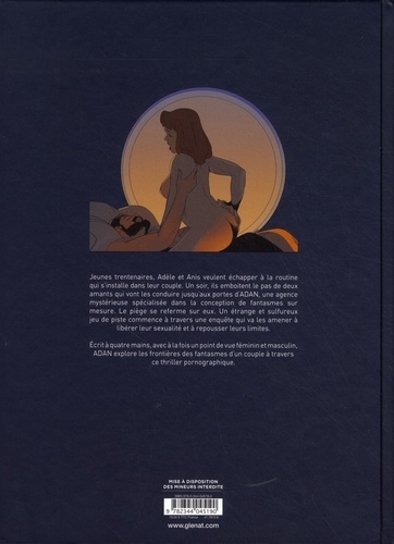 Jeunes trentenaires, Adèle et Anis veulent échapper à la routine qui s'installe dans leur couple. Un soir, ils emboitent le pas de deux amants qui vont tes conduire jusqu'aux portes d'ADAN, une agence mystérieuse spécialisée dans la conception de fantasmes sur mesure. Le piège se referme sur eux. Un étrange et sulfureux jeu de piste commence à travers une enquête qui va les amener à libérer leur sexualité et à repousser leurs limites. Ecrite quatre mains, avec à la fois un point de vue féminin et masculin, ADAN explore tes frontières des fantasmes d'un couple à travers ce thriller pornographique.