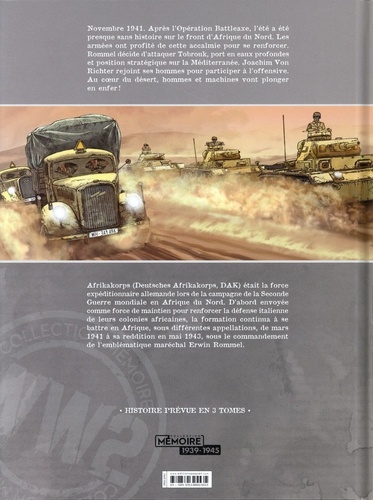 Novembre 1941. Après l'Opération Battleaxe, l'été a été presque sans histoire sur le front d'Afrique du Nord. Les armées ont profité de cette accalmie pour se renforcer. Rommel décide d'attaquer Tobrouk, port en eaux profondes et position stratégique sur la Méditerranée. Joachim Von Richter rejoint ses hommes pour participer à l'offensive. Au coeur du désert, hommes et machines vont plonger en enfer ! Afrikakorps (Deutsches Afrikakorps, DAK) était la force expéditionnaire allemande lors de la campagne de la Seconde Guerre mondiale en Afrique du Nord. D'abord envoyée comme force de maintien pour renforcer la défense italienne de leurs colonies africaines, la formation continua à se battre en Afrique, soue différentes appellations, de mars 1941 à sa reddition en mai 1943, soue le commandement de l'emblématique maréchal Erwin Rommel.