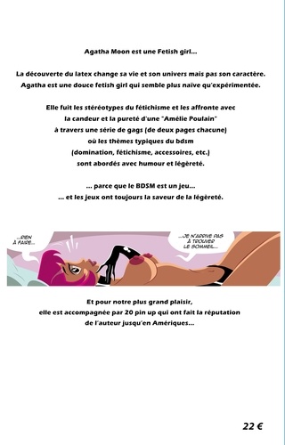 Agatha Moon est une Fetish girl... La découverte du latex change sa vie et son univers mais pas son caractère. Agatha est une douce fetish girl qui semble plus naïve qu'expérimentée. Elle fuit les stéréotypes du fétichisme et les affronte avec la candeur et la pureté d'une "Amélie Poulain" à travers une série de gags (de deux pages chacune) où les thèmes typiques du bdsm (domination, fétichisme, accessoires, etc.) sont abordés avec humour et légèreté. ... parce que le BDSM est un jeu... ... et les jeux ont toujours la saveur de la légèreté. Et pour notre plus grand plaisir, elle est accompagnée par 20 pin up qui ont fait la réputation de l'auteur jusqu'en Amériques...