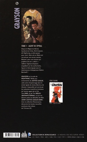 Depuis le Règne du Mal du Syndicat du Crime, Dick Grayson, dit Nightwing, se fait passer pour mort. Mais cet ex-Robin est recruté par son ancien mentor, Batman, pour une mission qui profitera de son " décès " : infiltrer l'agence d'espions enquêtant sur les surhumains, Spyral, et faire équipe avec la talentueuse et dangereuse Helena Bertinelli ! (Contient : Grayson #1-8, Annual 1 + Secret Origins #8)