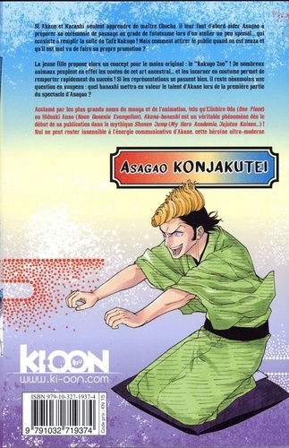 La nouvelle étoile du manga entre en scène ! Si Akane et Karashi veulent apprendre de maître Chocho, il va d'abord leur falloir aider Asagao à préparer sa cérémonie de passage au grade de futatsume lors d'un atelier un peu spécial... qui consiste à remplir la salle du Café Rakugo ! Mais comment attirer le public quand on est zenza et qu'il est mal vu de faire sa propre promotion ? La jeune fille propose alors un concept pour le moins original : le "Rakugo Zoo' ! De nombreux animaux peuplent en effet les contes de cet art ancestral... et les incarner en costume permet de remporter rapidement du succès ! Si les représentations se passent bien, il reste néanmoins une question en suspens : quel disciple sera choisi pour la première partie du spectacle d'Asagao ? Acclamé par les plus grands noms du manga et de l'animation, tels qu'Eiichiro Oda ( One Piece ) ou Hideaki Anno ( Neon Genesis Evangelion ), Akane-banashi est un véritable phénomène dès le début de sa publication dans le mythique Shonen Jump ( My Hero Academia , Jujutsu Kaisen ...) ! Nul ne peut rester insensible à l'énergie communicative d'Akane, cette héroïne ultra-moderne adepte d'un art ancestral !