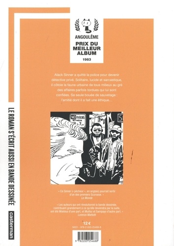 Privé new yorkais inspiré des archétypes de l'âge d'or du roman et du film noir américain, Alack Sinner résout les affaires les plus tordues et transcende les influences hardboiled de ses auteurs pour toucher au coeur même de l'humain. L'expérience de l'exil de Munoz et Sampayo a donné naissance à cette série au long cours, créée dans les années 1970 et dans laquelle le héros vieillit (chose assez rare en bande dessinée). Portées par un noir et blanc d'une grande expressivité, les enquêtes et les filatures de Sinner sont l'occasion de présenter tout un microcosme social, entre code de conduite et corruption, déracinement et amour...