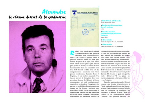 Ancien géomètre, dessinateur humoristique en presse dès 1956, Robert Huet, dit Alexandre (1930-2002), se tourne rapidement vers la carte postale grivoise, domaine dans lequel on ne lui connaît aucun rival, tant par le foisonnement de sa production (près de 2 000 modèles recensés), les chiffres de tirage atteints (plus de 40 millions de cartes postales écoulées, 925 000 exemplaires pour la série « On a l'âge de son zizi ») que par sa décomplexion totale et l'assiduité avec lequel il persistera toute sa vie à ne parler que de fesse. Vache à lait des éditions Marcel Vaysse dans les années 60, puis des éditions Lyna-Abeille cartes, Alexandre représente la quintessence de l'esprit franchouillard et gaulois, comme l'attestent les thèmes qu'il ne cessera de reprendre pendant toute sa carrière : la chasse, la pêche, la pétanque, le camping, les naturistes, les curistes, les bidasses, les cocus… Il était plus que temps de lui rendre hommage. Présents sur les tourniquets de toutes les maisons de la presse dans les années 70-80, les personnages à gros nez, les petites mamies (que Faisant aurait copiées !) et les pin-ups d'Alexandre ont marqué involontairement l'inconscient des français en vacances. Un univers fascinant à (re)découvrir, via plus de 550 documents et dessins en couleur.